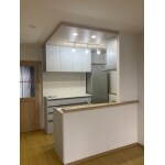 吊戸、腰壁、間仕切り壁をなくして、オープンの対面型キッチンにしました。天井にはダウンライトやスポットライトでキッチンを明るくおしゃれに演出しています。