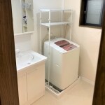 TOTOのVシリーズW750を施工させて頂きました。 洗濯パンも交換し、内装も一新させて頂きました。 また、お客様の希望で脱衣所の入口の扉を引戸から開き戸へ交換させて頂きました。