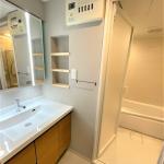 お風呂は清掃性の高いリラックスできるTOTOのマンションリモデルバスルームを提案させて頂きました。 洗面化粧台は上部に梁が通っており高さに制限があったため、ミドル部をなくし高さを調整させて頂きました。 ニッチ収納部分は棚を造作し、再利用させて頂きました。