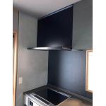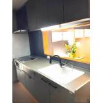 キッチンはトクラスのBbをご提案いたしました。トクラスといえば人造大理石といわれるほど人大で人気のメーカーです。黒を基調としたかっこよさにこだわったキッチンですが、見た目だけではなく機能性や清掃性も抜かりない仕様になっております。カウンターから排水口が一体形状のためお掃除しづらい隙間汚れが溜まりません。水栓はオシャレなグースネックで、大きなお鍋などを洗う際もシンクへの出し入れがしやすい形状です。カラーはこだわりのマットブラックで高級感を演出してくれています。
