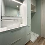お客様のご要望にお応えし、洗面化粧台には、TOTO製「オクターブ」を採用。タッチレス&スマートな機能を備えたスタイリッシュドレッサーで、自動機能や除菌機能により毎日の使い勝手が向上し、お掃除の手間も軽減されます。 また、洗濯機置場の折戸を取り外し、作業のしやすさ、空間の美しさを保つために吊戸を設置。収納力とデザイン性を両立したレイアウトに仕上げました。 内装は、自然な温もりを感じる木目調フロアと、爽やかなブルー系の壁紙パナシェアクア色を採用。他のお部屋との統一感を持たせつつ、上品で落ち着いた雰囲気を演出します。機能性とデザイン性を兼ね備えた快適な空間をご提案いたしました。