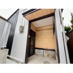 雪国の住宅のように玄関前にインナースペースがあります。その壁面には天然杉板を貼りました。杉材は雨ざらしでも使える優れた壁材です。