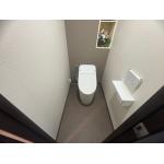 コンパクトなタンクレストイレに取替えると足元が広くなり、アクセントクロスとクッションフロアの色目を揃えることでモダンに仕上がりました。