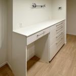 壁を取り払うことで開放感のあるペニンシュラタイプへと変更し、より広々とした空間を実現しております。また、耐力壁仕様とし、背面には可動棚スペースを造作しました。