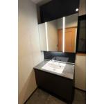 洗面室全体の内装と洗面台をトータルコーディネートさせていただきました。背面化粧パネルにテーマカラーのブラックをポイントに施しました。奥さまや娘さまが身支度する際には、フェイスフルライトの光を3段階で調整ができるのも嬉しいですね。ルミシスのインナー引き出し付きのフルスライド収納には従来、洗濯機まわりにあった洗剤などもスッキリ納めれるようになりました。生活感がないエレガントでホテルような空間を演出できました。