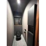 ブラックのトイレをご要望でしたので合わせて、内装や紙巻き器、収納棚にスイッチコンセントもグレーと黒でコーディネートをさせていただきました。ニッチ収納も新しく施したことでお掃除道具もしっかり見えなく収納できますね。