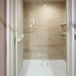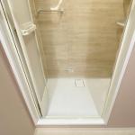 シャワールームに変更して、入口の段差を解消。開き戸から折戸ドアに変更しました。