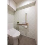 ダマスク柄のアクセントクロスがエレガントで上品なトイレ空間