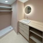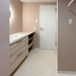 今回のリフォームでは、ミラタップの丸い照明付きミラーを採用しました。洗面空間にぴったりと調和する色合いの壁紙とともに取り入れました。選んだ壁紙は、少しくすんだお洒落なピンク色で、柔らかな色合いが洗面所全体に温かみと落ち着きを与え、ミラーの間接光がその美しさを引き立てます。さらに、TOTO製のドレーナを設置し、そのデザインとも調和よくマッチするように配置しました。洗面所の機能性と美しさが見事に融合した空間が完成しました。浴室を狭くした分、洗面所側にゆとりを持たせ、洗濯機上にはオープン棚と室内物干しを設置し、収納力と実用性を兼ね備えた使い勝手の良い空間に仕上がっています。全体的に、お洒落で快適な空間が実現され、毎日の生活がさらに便利で心地よくなりました。