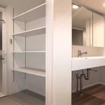 エレガントな白の美しさが引き立つサンワカンパニーのフィオレット1200巾を採用し、三面鏡収納付きで機能的かつ美しいデザインに仕上げています。