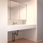 壁埋没タイプの収納棚があり、洗面化粧台下が収納スペースになっていました。モダンな黒の扉パネルと石目模様のカウンター、大きな鏡の洗面化粧台でした。