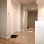 今回のリフォームでは、お客様のご希望をもとに、上質で洗練された玄関空間を実現しました。床には、やわらかな色合いと光沢感のある石目模様のタイルカーペットを採用し、足元から優雅な雰囲気を演出しています。天井まで届く白いシューズボックスは、空間に美しく調和しながら抜群の収納力を確保。玄関正面の壁一面に設置した大型ミラーに、天井のダウンライトのやわらかな光を受けて、床やシューズボックスを映し出し、空間全体がつながりのある広がりを感じさせる演出となっています。まるでひとつの美しいインテリアシーンのように調和した玄関は、訪れる人をやさしく迎え入れる、明るく洗練された空間となりました。