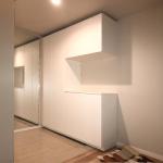 現在設置されているこげ茶色の腰丈のシューズ収納を、天袋付きで収納力のある大型のシューズボックスに交換したいと考えています。新しいシューズボックスの色は白を希望しており、空間全体を明るく清潔感のある印象にしたいと思っています。
