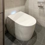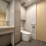 空間全体に洗練された美しさと快適性を追求したご提案をさせていただきました。まず、トイレにはTOTO製のタンクレストイレ「ネオレストAS2」を採用し、無駄のないシンプルで美しいフォルムが空間に調和するとともに、超節水タイプによる環境配慮と経済性も兼ね備えています。さらに、お掃除の手間を軽減する最新の清掃機能を備えており、日々のメンテナンスも快適にしていただけます。 空間全体の流れを大切にし、浴室から洗面、そしてトイレへと繋がる動線には統一感のある収納デザインを取り入れました。洗面と同じメーカーであるハンセム製の吊り戸を採用することで、空間全体に連続性と統一感をもたらし、視覚的な心地よさを演出しています。また、床と壁に選んだグレー系のタイルは、上質さと都会的な雰囲気を醸し出しながら、落ち着いた印象を空間にもたらしています。 全体として、実用性とデザイン性を高いレベルで融合させた、まさにプライベートリゾートのような洗練された空間へと仕上げることができました。
