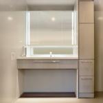 現在、広々としたラグジュアリーな浴室から、木目模様の収納で一体感をもたせたレストルーム仕様の洗面空間へと繋がる設計となっておりますが、今回のリフォームでは、さらに一歩踏み込んだ、まるで高級ホテルやリゾートのような、快適で上質なプライベート空間へと生まれ変わらせたいと考えております。 単なる機能性の向上にとどまらず、洗面設備についても、洗練されたデザイン性を取り入れることで、繊細で美しいデザインをご提案・ご施工いただければ幸いです。