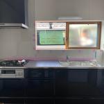 横一面のガラスを撤去し、シンプルな2枚引きの樹脂サッシへ変更。 明るさはそのままに、使い勝手がUP◎ 落ち着いた色合いのシステムキッチンで、空間もグッと引き締まった印象に!