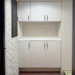 玄関まわりのリフォームでは、「明るくお洒落で高級感のある空間にしたい」というご要望をもとに、素材やデザインにこだわったご提案をさせていただきました。 壁面には、上質な質感と機能性を兼ね備えたリクシルのエコカラットを採用し、空間全体に上品な陰影と重厚感をもたらしています。光の当たり具合によって表情が変わるため、時間帯によって違った雰囲気が楽しめるのも魅力のひとつです。機能面でも、調湿や脱臭といった快適性を高める効果があり、玄関という空間にふさわしい素材となっています。 シューズボックスには、パナソニックの「ベリティス コンポリア」を採用しました。真っ白で光沢感のある美しい表面パネルが特徴で、空間を明るく清潔感のある印象に仕上げています。腰丈のベースキャビネットに加え、同じデザインで統一した吊り戸を設置することで、収納力を大幅にアップさせながら、すっきりとしたデザイン性も実現しました。 全体として、玄関に入った瞬間に洗練された雰囲気を感じられる、上質で居心地の良い空間に生まれ変わっています。