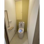 トイレ正面の壁に淡いイエローの壁紙を貼り、収納扉も合わせてイエローのダイノックシートを貼りました。