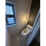 トイレ背面と床材は、お施主様お好みのグレーに。ペンダントライトもセットし、やさしく照らしてくれる空間としました。