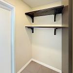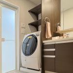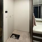 ご要望いただきました洗濯機置場上部の棚は、収納力を向上させるため、一段から二段へと増設いたしました。以前は白色の棚板でしたが、今回は洗面室全体の調和を考慮し、既存の洗面化粧台の扉のデザインに合わせ、濃茶色の板目模様が美しいソフトウォールナット柄を採用いたしました。これにより、温かみのある落ち着いた印象となり、洗面空間に上質なアクセントが加わったかと存じます。 また、浴室ドアが広くなりましたので、洗面室内のスイッチパネルの位置を移動し新しいものに交換いたしました。また、洗濯機の排水位置についても、よりスムーズな排水となるよう、最適な位置へと移動させて頂きました。 今回のリフォームにより、浴室だけでなく洗面室も、収納力とデザイン性が向上し、より快適で機能的な空間へと生まれ変わりました。