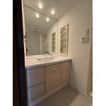 洗面化粧台の下台と照明器具を交換して、温かみのあるおしゃれな空間になりました。