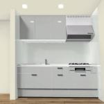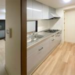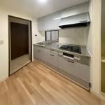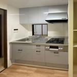 明るい色のフローリングを上貼りしたことで、シルバーグレーの落ち着いたカラーが空間全体に洗練された印象を与えています。見た目にも機能面にも優れ、さらに清掃性にも配慮されたこのキッチンは、内見時にも好印象を与える空間に仕上がっています。