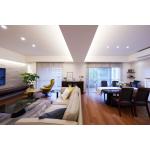 おしゃれな印象にするために、梁を利用したコーブ・コーニス照明をプラン。 既存のダクトスペースとデザインを揃えるためあえて窓側に梁型を設け、バーチカルブラインドがすっきりと収まるようにも工夫しました。 TVボードの背面にはエコカラットを施工し、間接照明で映えるように演出。 厚みが異なる90mmと60mmのテレビボードを取り付けデザイン性のある印象になっています。 インターホンやスイッチをすっきりと収めれるよう壁面に機能ニッチも造作しました。