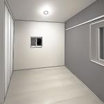 洋室(3) 白い壁側の奥に既存のシャッターがあります。どちらの窓にもLIXILインプラスを設置しています。コンクリート床の上に二重床を造作し、断熱対策も万全。フローリングには、Panasonicベリティスフロアー ダブルコートのアイボリーアッシュ柄を採用しました。全体的に、明るく落ち着いた空間となっています。