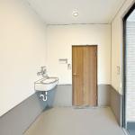 ガレージの右側シャッターの壁には、玄関に直接アクセスできる引き戸の出入り口がありました。収納クローゼット横に簡易手洗い器が設置されていいました。