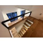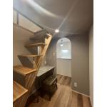 1段目を高さ2m程にすることで 安全性、梁の圧迫感回避、荷物の搬入しやすさ、ベンチ替わり などなど多くの利点を創り出しました。 床材もほぼ無垢のフロアのような触り心地の挽き板フロア。 照明との距離が近くなり、嫌なまぶしさが無いように間接照明などにも気を使いました。