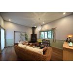 以前のLDKです。木の質感に包まれ、存在感のある暖炉や明暗のメリハリを付けた照明位置からも、別荘のような落ち着きを感じる空間でした。