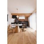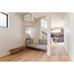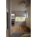 下がり天井を木目クロスでアクセントにしたフラット対面キッチン。バーチカルブラインドで光をコントロールできるように。 物が多くなりがちなシューズクロークは家族専用の動線に。1つの玄関の中に家族とゲストの2つの動線を設けました。