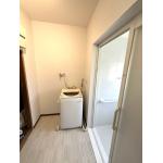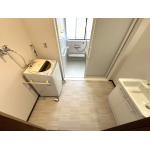 洗面所の工事では、洗面台の取替、既存の床・壁タイルをすべて解体し、真壁から大壁のクロス仕上げに変更、洗濯機を2台設置できるように電気・排水の増設工事を行いました。