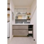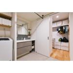 洗濯して、干して、WICにしまっての動線が短くてとても便利。AICAのスマートサニタリーはまるで造作洗面の様な仕上がりが楽しめる優れモノ。今回は平田タイルて上質感のある仕上がりに。