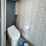 玄関を入ってすぐ左手にある既存のトイレは、使いやすさを重視し、位置はそのままにして動線を変えずにリフォームを行いました。 限られた空間をより快適に使えるよう、従来の開き戸から引き込み戸に変更し、開閉時のストレスを軽減しました。 設備にはTOTOの「リモデルトイレGG1」タンクレストイレを採用。すっきりとしたデザインで空間にゆとりを感じさせるとともに、洗浄力と節水性能を両立したモデルで、子育てエコホーム支援制度の対象となる節水型トイレです。 内装にもこだわり、壁にはグレー地にやさしい模様が入った量産クロスをベースに、ネイビーグレイのアクセントクロスを組み合わせ、落ち着きの中にさりげないおしゃれを感じられる空間に仕上げました。床材は木目調のクッションフロアを選定し、ぬくもりを感じるナチュラルな印象に。水まわりらしい清潔感と住宅全体との統一感を両立しています。