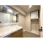 スペースを有効活用し、収納の空間が広くなった上質感のあるホテルライクなデザインの洗面所