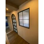 既存のリビングドアが木目のアーチ型でかわいい感じでしたので、うまく調和するような格子窓を設けました。