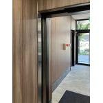 エレベータホールから繋がる空間として、訪れた人の一連の動線を上質にお招きするよう、イメージを合わせるご提案をしました。ただし、狭い空間なのでエレベータドアの内側は黒い外側とは異なり、閉塞感の少ない明るいカラーのシート張りをご提案しました。