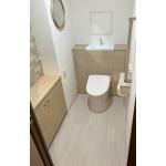 経年劣化と内装や収納の汚れが目立ち、リフォームをご依頼いただきました。 タンク裏と便座との隙間の掃除を軽減するため、TOTOの「レストパル」を施工。 背面にタイル調のアクセントクロスを貼りたいとご希望でしたが、大きな点検口があるため代わりに左壁にエコカラットと既存収納のシート貼りを行いました。どちらもレストパルのキャビネットの色味を合わせ、統一感が出ました。 内装に合う丸鏡もご提案し、理想通りの仕上がりだと喜んでいただけました。