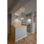 夜だけロールスクリーンを下ろし、息子さんが布団を敷いて寝ている畳コーナーには造作の本棚も設けた。