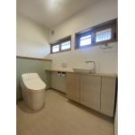 もともと洋式便器と小便器で分かれていたおお手洗いでしたが、1つにすることで広々! 壁は漆喰を採用、優れた調湿効果と消臭効果、抗菌・高ウィルス効果もあるで、お手洗いが快適な空間とありました。