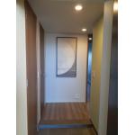 玄関正面の壁にデザインパッケージのエコカラットを飾り、アクセントのある空間の演出ができました。においがこもりがちな玄関の脱臭や、雨の日のジメジメした湿度を調整し心地よくお迎えできます。