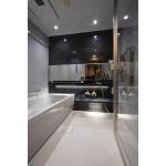 黒を基調としたアクセントパネルと間接照明が、高級ホテルのような空間を演出。水はけの良い床はお手入れも簡単で、デザイン性と機能性を両立させました。