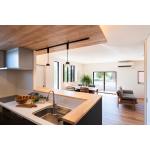 LDKと一体化したことで明るいキッチンへ。 生活感を極力出さないように食器や家電は背中の扉内にすべて収納できるように設計。 会話が弾むキッチン空間へ