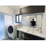 お風呂はLIXILのリデアをご提案しました。 「スマートエスコートバー」は手すりの役割も兼ね備えており、バーを伝いながら安全に浴槽に入れます。 おばあ様だけでなく、家族みんなに使い勝手の良いアイテムです。 また、従来の手すりのデザインとは異なり、見た目もスタイリッシュです。 洗面はパナソニックのシーラインをご提案。 ボウル横のカウンターは下部をオープンにし、座って身支度が出来るようにしました。 3世代の暮らす朝の洗面化粧台は大変混み合うため、出来る限り洗面化粧台のスペースを広くとりました。 こだわりのクロスと洗面扉の色が相まって、上品な仕上がりになりました。
