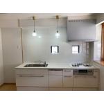 リフォーム後のキッチンは、明るく清潔感のあるホワイトを基調としたデザインに一新されました。ワイドなシステムキッチンには使いやすい引き出し式収納を採用し、調理器具や食器もすっきりと片付きます。 最新のレンジフードとガスコンロ、食洗機も備え、使い勝手と機能性が大幅に向上しました。