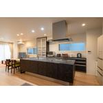 「アイランドキッチン」という明確なご希望があり、キッチンを中心にゆったり過ごしていただける間取りをご提案しています。LDKから洗面コーナーへは建具を設けずオープンにして、将来車いすを利用される場合でも方向転換や移動をしやすくしました。収納や棚の位置などは使い勝手を考えて工事中に確認しながら進めています。ペット対応のフローリングも採用しました。