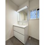 シンプルながらも広めの洗面ボウルと収納力のある洗面台を採用。