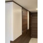 床とドア、腰壁部分の木目の色合いが合い、少し重厚感のある落ち着いた印象の廊下。