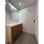 洗面台、内装を一新したことで素敵な洗面室に仕上がりました。床はタイル調のクッションフロアになります。丈夫でデザインも豊富なので人気の床材です。